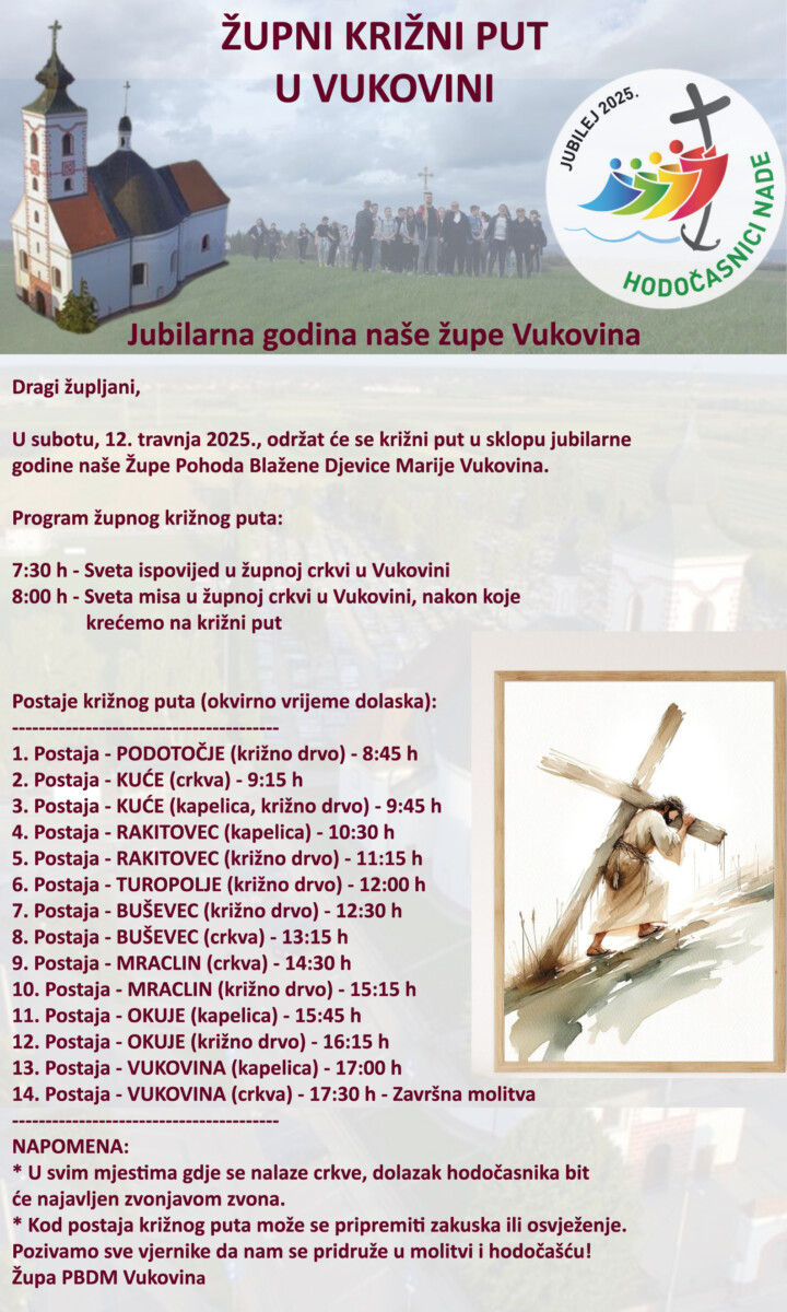 Dragi župljani, U subotu, 12. travnja 2025., održat će se križni put u sklopu jubilarne godine naše župe Vukovina. Program župnog križnog puta:7:30 h – Sveta ispovijed u župnoj crkvi […]