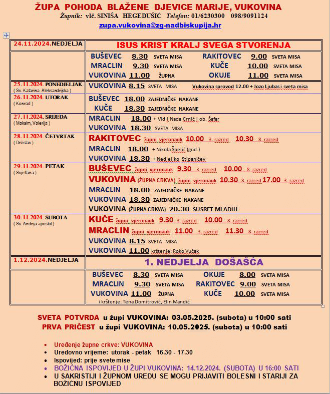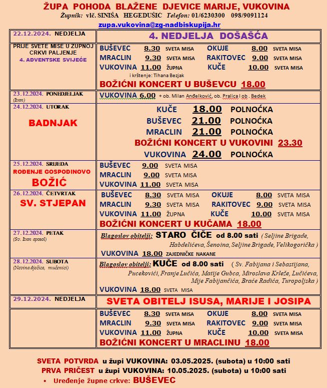 Dostupan je novi župni listić od 5. do 12 . siječnja 2025. s raspored svetih misa i pastoralnih događaja župe Vukovina. Župa PBDMzupa-pbd-marije.hr