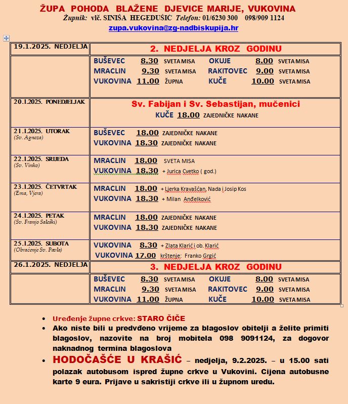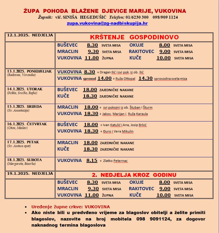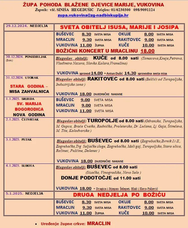 Dostupan je novi župni listić od 5. do 12 . siječnja 2025. s raspored svetih misa i pastoralnih događaja župe Vukovina. Župa PBDMzupa-pbd-marije.hr
