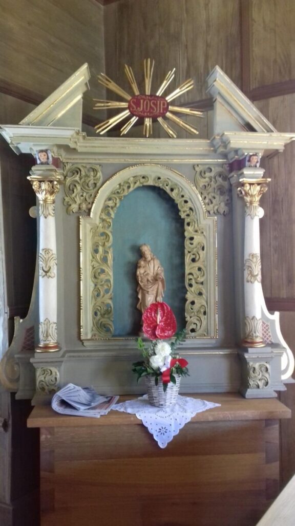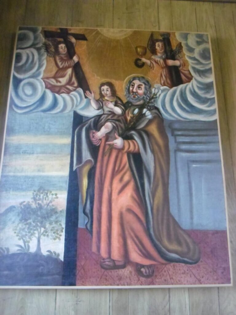 Ikonografija sv. Josipa s djetetom Isusom postaje popularna u poslijetridentskom periodu kada sv. Josip preuzima dotadašnju Bogorodičnu ikonografiju koja uključuje prikaz Bogorodice s Isusom u naručju. Bogorodica u to vrijeme dobiva vlastitu ikonografiju poput Bezgrešnog Začeća, a sv. Josip je sve češće prikazivan s Djetetom u naručju s ciljem populariziranja tog sveca i nastojanja da mu se pripiše veća uloga od dotadašnje u kršćanskoj umjetnosti te se sada želi prikazati kao uzor kršćanskoga oca. Na slici u kapeli na strani Evanđelja Sv. Josip drži svoj simbol ljiljan u jednoj ruci, a u drugoj malenog Isusa, iznad njih se na oblacima nalaze dva anđela koja nose križ i kalež, kao simbole vjere, stup kao simbol postojanosti te vijenac kao simbol nebeske slave. Inače su ti simboli uobičajeni za ikonografiju arma Christi odnosno simbola Kristove muke. Ova slika je svjedočanstvo pučke umjetnosti s uzorom u gotičkom stilu s okruglim očima i zarumenjenim obrazima, ali i teških draperija i nezgrapnih masa tijela. Slikar pokušava prikazati dojam unutrašnjeg prostora smještajući figure unutar arhitekture, ali zatim povlači jasnu granicu tog unutrašnjeg prostora i krajolika na lijevoj strani slike i time gubi na realističnom prikazu i vjerodostojnosti što se tiče perspektive i dubine prostora. Na temelju formalnih karakteristika Mirjana Repanić-Braun (1988.) ovu sliku datira u drugu polovinu XVII. stoljeća.