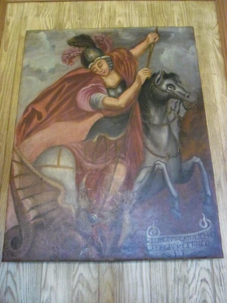 Prizor Sv. Juraj ubija zmaja iz prve polovine XVIII. stoljeća svjedoči tipičnoj ikonografiji sv. Jurja na konju kako ubija zmaja i nalazi se na lijevom zidu kapele. Sv. Juraj proporcionalno ne odgovara konju kojeg jaše i koji je manji od samog sveca te sam položaj sveca na konju sugerira čudnu torziju svečeva tijela. Signatura opet svjedoči o naručiteljima slike »GEORGIUS CATOLICH ET/ GEORGIUS CERNCO/ F: F:«.
