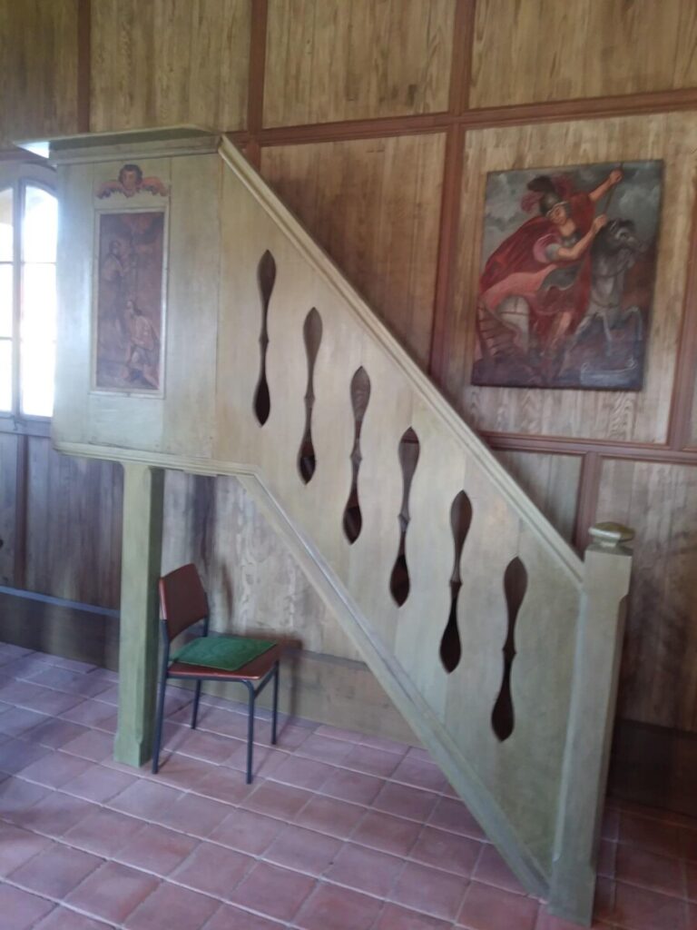 Jednostavna dvostrana propovjedaonica s prilaznim stubama nalazi se na lijevoj strani kapele. Na prednjoj strani je uklada sa slikom na dasci s prikazom Krštenja Kristova, iznad ovog prizora je naslikana anđeoska glavica s krilima. Na bočnoj strani je također slika na dasci unutar uklade s nepoznatim prizorom. Slikarske karakteristike i oblikovanje likova upućuju na kraj XVII. stoljeća, ali slike su izblijedjele i teško je točno odrediti razdoblje. Moguće je da se radi o propovjedaonici za koju je Đurđica Cvitanović (2008. [1974.]) spomenula da je bačena na tavan, a na kojoj su bile očuvane slike srodne ostalim slikama u kapeli.