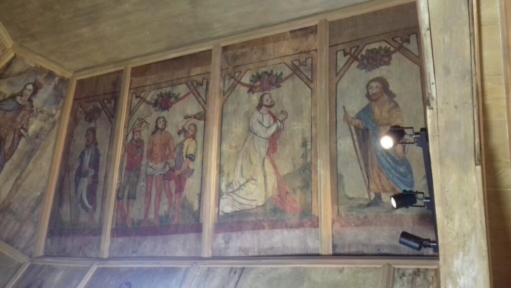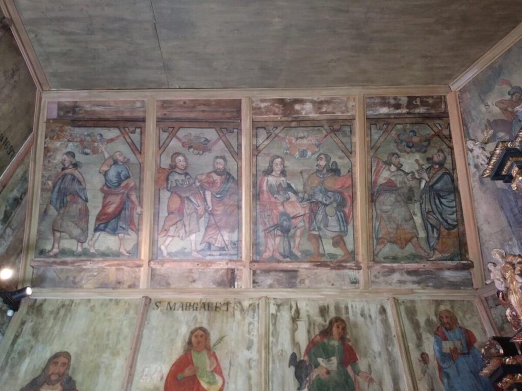 Oslikani zidovi prikazuju prizore iz Evanđelja, odnosno iz Kristova života kao što su Krist u Getsemanskom vrtu, Bičevanje Krista i Raspeće, zatim svece-zaštitnike poput sv Martina, sv. Katarine, sv. Jurja i sv. Margarete i kultova kao Srce Isusovo i Srce Marijino. Poseban i rijedak prizor je Rastanak apostola u kojem se pozdravljaju dvojica po dvojica apostola koji odlaze propovijedati evanđelje u Kristovo ime. Anđela Horvat (1982.) datira ove oslike u kraj XVII. stoljeća i prvu polovinu XVIII. stoljeća te ih određuje kao rustificirano figuralno slikarstvo ekspresivnog i naivnog izraza. Sanja Cvetnić (2005.) cjelokupni oslik uspoređuje s gotičkim ostvarenjima, što se najviše vidi u velikim očima i zarumenjenim obrazima mlađih apostola koji kao da se ugledaju na tzv. lijepe Madonne (njem. Die Schöne Madonna) koje su bile omiljene u južnoj Njemačkoj i Štajerskoj. Iznad svakog prizora vise fruktoni, inače renesansna značajka, koji su se održali u leksiku kasnijeg, u ovom slučaju baroknog razdoblja. Leksik je renesansni, ali način izvedbe tih fruktona ukazuje na XVII. stoljeće zbog nastojanja da ih se iluzionistički postavi u prostor, a dodatna potvrda da se radi o baroknom stoljeću jest povremeni pokušaj slikara da ruke ili dijelove odjeće likova prikaže izvan naslikanih okvira – želi predočiti dojam ulaska u stvaran prostor. Iz fruktona visi šipak ili morganj kao simbol jedinstva Crkve i grozd koji predstavlja krv Kristovu što dokazuje da je slikar ovih prizora bio svjestan ikonografije i simbolike koju ona predstavlja. Postoji mogućnost da je na ikonografiju utjecao upravo netko od župnika s kraja XVII. stoljeća, koji je za slikara mogao nabaviti i potrebne predloške. Evanđelisti su prikazani ikonografski točno svaki sa svojim atributom: sv. Luka s volom, sv. Matej s anđelom, sv. Ivan s orlom i sv. Marko s lavom iako je s posljednjim slikar imao problema u prikazu zoomorfnog simbola lava jer je to životinja koju zasigurno nije dobro poznavao, a kamoli vidio uživo. Evanđelisti su izvedeni nešto slabije od apostola u prizoru Rastanka, ali uz ikonografsku točnost ispod svakog je dodan i napis s imenom. Prikazi Srca Isusova, Srca Marijina i sv. Margarete na bočnim zidovima kapele su zasigurno kasniji rad nepoznatog slikara. Likovi na njima su znatno veći od ostalih i vjerojatno