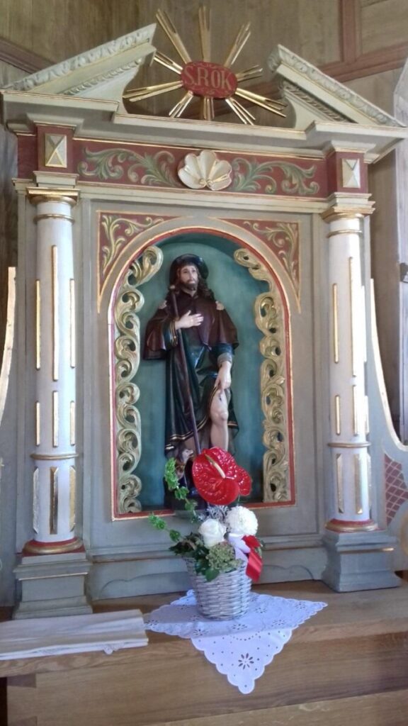 Skulptura sv. Roka za oltar sv. Roka na strani Evanđelja nabavljena je tijekom obnove kapele 1907. godine. Laszowski i Barlè (1911.) navode da je zajedno sa skulpturom sv. Josipa nabavljena kod Tirolca Ferdinanda Stufflesera, ali za to nema potvrde u župnoj spomenici. Skulptura prikazuje sv. Roka u njegovoj karakterističnoj ikonografiji: odjeven je u hodočasničku odjeću sa školjkom na oba ramena (jakobska kapica), nosi štap u ruci i pokazuje na kužnu ranu na lijevom bedru. Podno nogu mu je njegov vjeran pratitelj pas. Sv. Rok smješten je u nišu koja je ukrašena rezbarenim akantovim lišćem. Zabat oltara je prekinut i tu se nalazi pločica s natpisom »S. ROK« iz koje izlaze zrake svijetlosti. Martina Ožanić (2017.) navodi da se po arhitektonskoj konstrukciji i motivu dijamanta na trabeaciji može datirati oltar u prvu polovinu XVII. stoljeća.