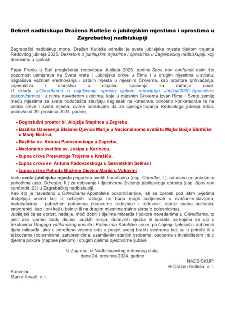 Dekretom nadbiskupa Dražena Kutleše župna crkva Pohoda Blažene Djevice Marije u Vukovini proglašena svetim jubilejskim mjestom i mjestom oprosta