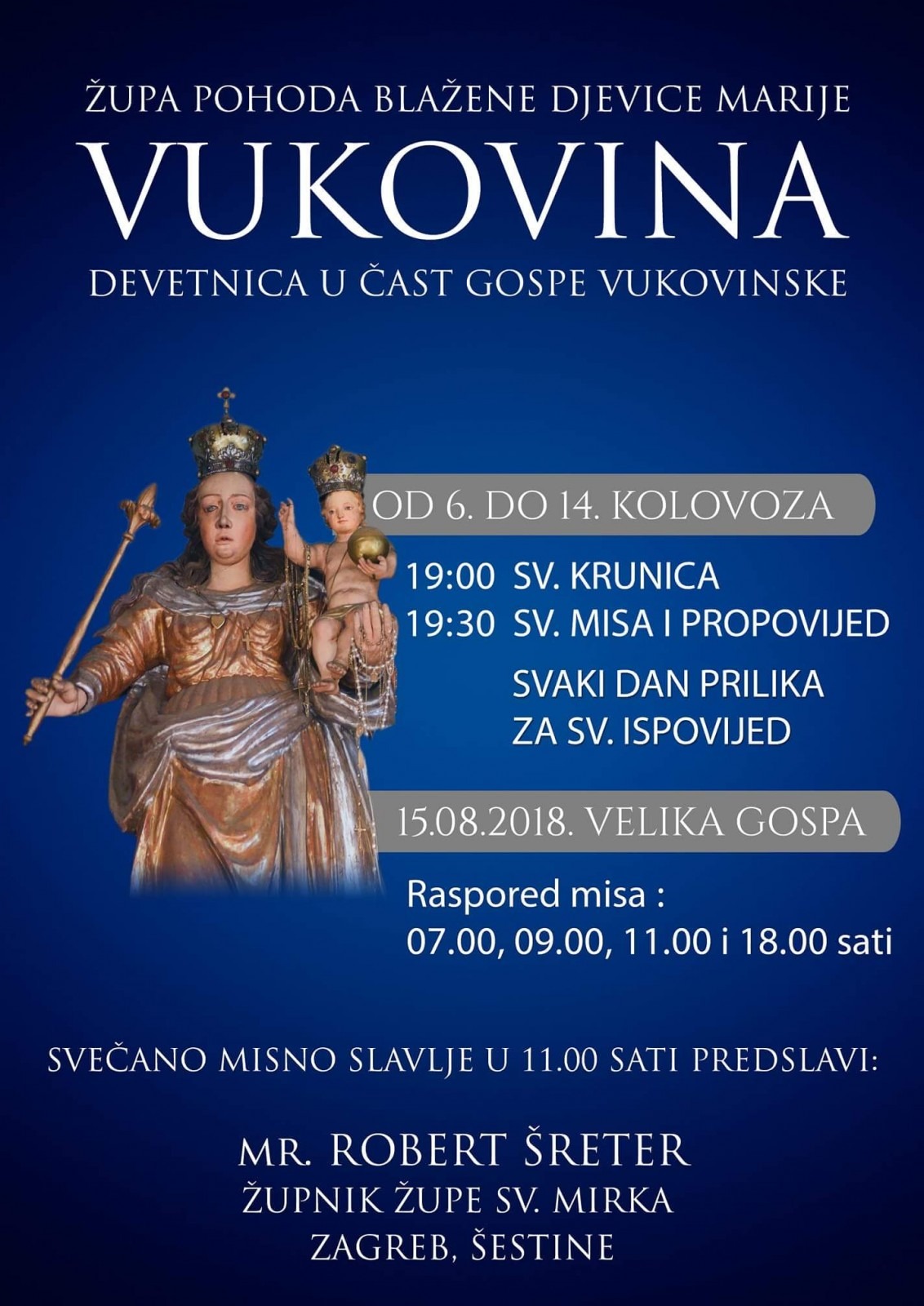 Svi štovatelji Majke Božje Vukovinske u župnoj crkvi u Vukovini od 6. do 14. kolovoza Devetnicom će se pripremati za župno proštenje, svetkovinu Uznesenja Blažene Djevice Marije na Nebo – Veliku Gospu.