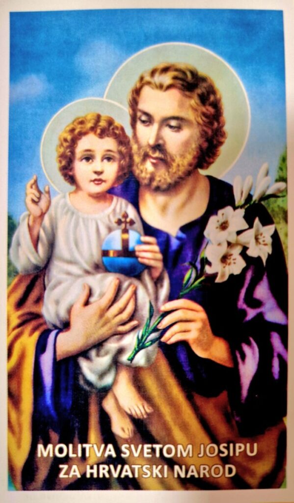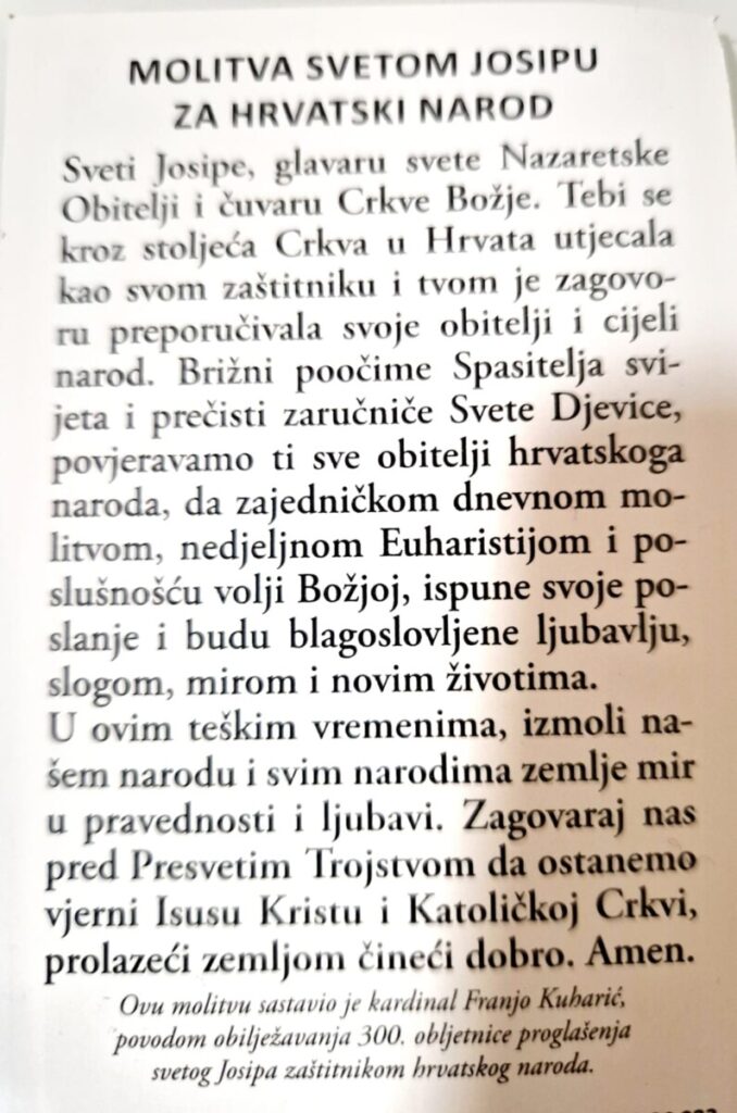 Sveti Josipe, glavaru svete Nazaretske Obitelji i čuvaru Crkve Božje. Tebi se kroz stoljeća Crkva u Hrvata utjecala kao svom zaštitniku i tvom je zagovoru preporučivala svoje obitelji i cijeli narod. Brižni poočime Spasitelja svijeta i prečisti zaručniče Svete Djevice, povjeravamo ti sve obitelji hrvatskoga naroda, da zajedničkom dnevnom molitvom, nedjeljnom Euharistijom i poslušnošću volji Božjoj, ispune svoje poslanje i budu blagoslovljene ljubavlju, slogom, mirom i novim životima.