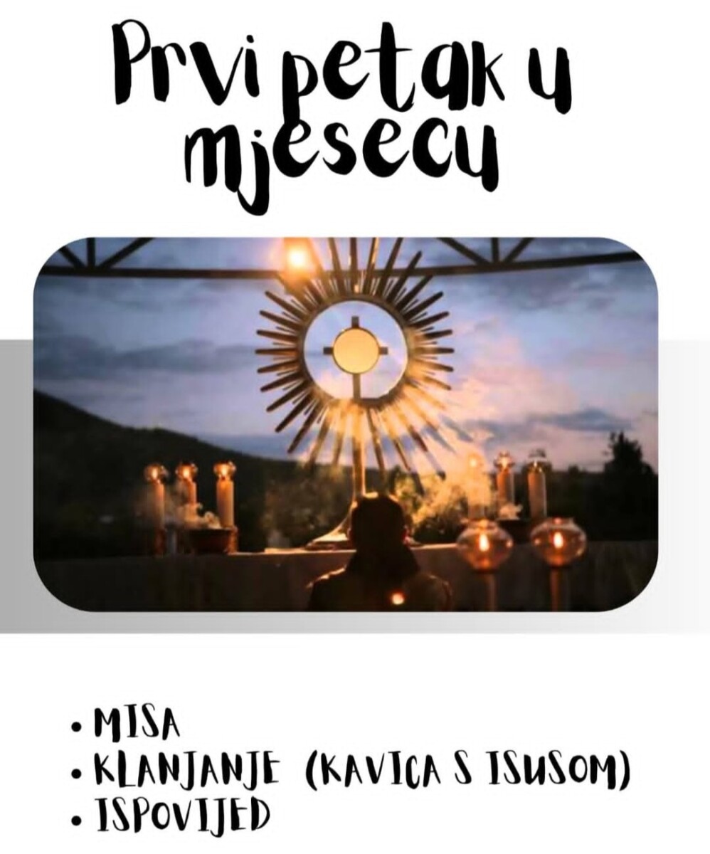 Danas, na prvi petak u mjesecu, u našoj župnoj crkvi održat će se euharistijsko klanjanje pred Presvetim oltarskim sakramentom.