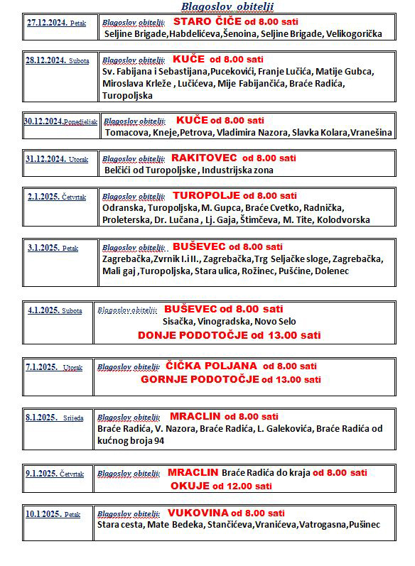 U Hrvatskoj postoji stara tradicija koja se zove blagoslov obitelji, gdje svećenik posjećuje obitelji i blagoslivlja njih i njihove kuće. Blagoslovi obitelji počinju na Štefanje (26. prosinca) i obično traju do Sveta tri kralja. Svećenik dolazi u pratnji zvonara i još jednog pomoćnika.