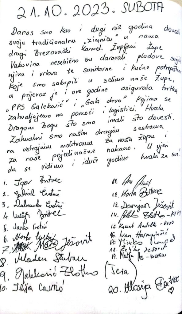 Kao i svake godine župljani župe Vukovina darovali su zimnicu za naše časne u dragom brezovičkom Karmelu. Plodovima svojih njiva i vrtova, uz puno sanitarnih potrepština, ispunili su veliki kamion i kombi. Prijevoz su i ove godine organizirale tvrtke PPS Galeković i Gala drvo kojima zahvaljujemo na pomoći i logistici.