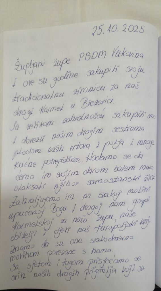 Župljani Župe Pohoda Blažene Djevice Marije iz Vukovine jučer, 25. listopada 2025., ponovno su organizirali tradicionalnu akciju prikupljanja zimnice za sestre Karmelićanke u Brezovici.